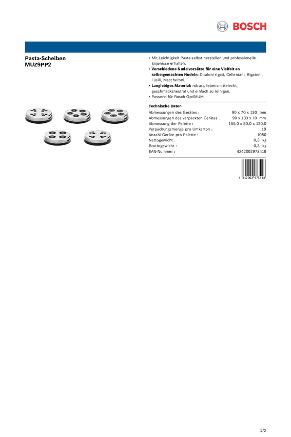 Bosch Haushalt MUZ9PP2 Przystawka do makaronu stali szlachetnej