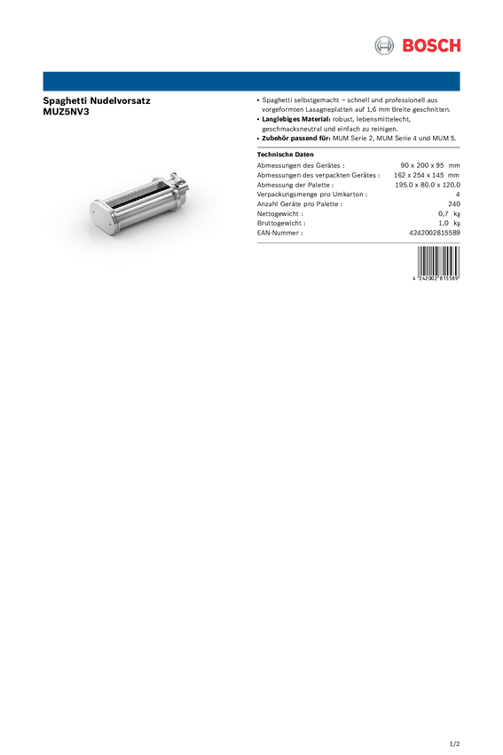 Bosch Haushalt MUZ5NV3 Przystawka do makaronu stali szlachetnej