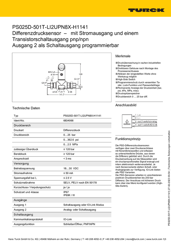 Turck Przełącznik 1 szt. PS025D-501L-2UPN8X-H1141 0 bar do 25 bar