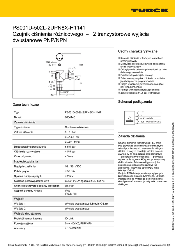 Turck Przełącznik 1 szt. PS001D-502T-LI2UPN8X-H1141 0 bar do 1 bar