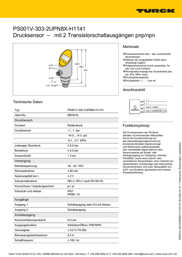 Turck Przełącznik 1 szt. PS001V-504-LI2UPN8X- H1141/3GD -1 bar do 1 bar