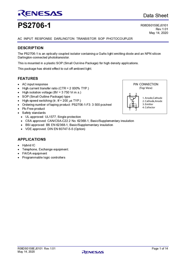 High Isolation Voltage Darlington Transistor SOP MULTI Photocoupler Series