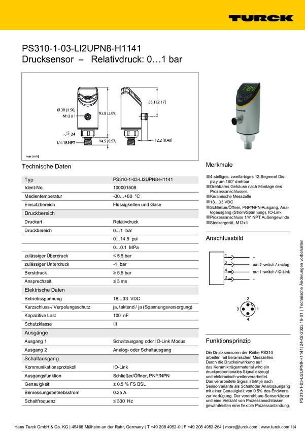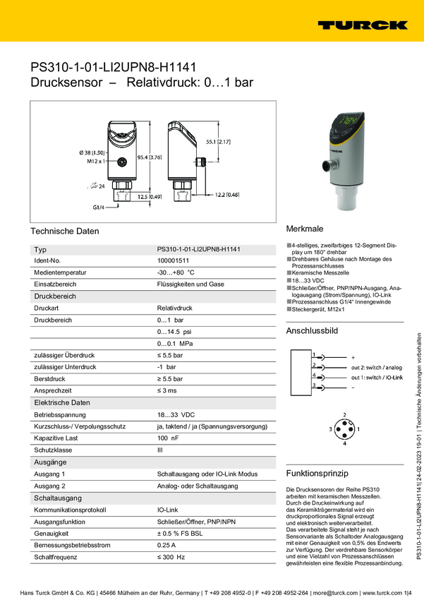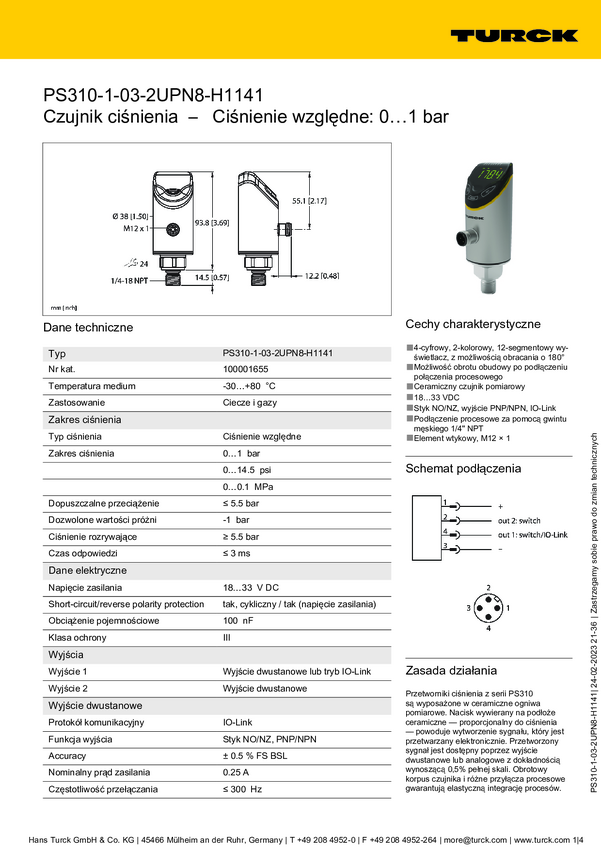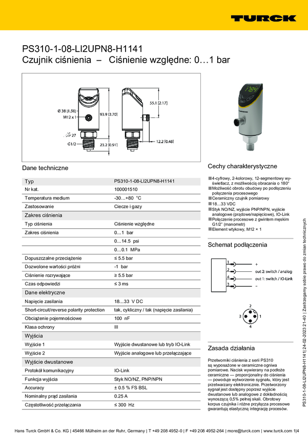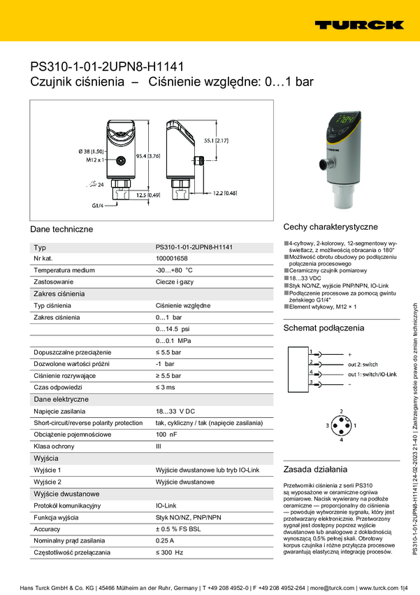 Turck Przełącznik 1 szt. PS310-1A-01-LI2UPN8-H1141 0 bar do 1 bar