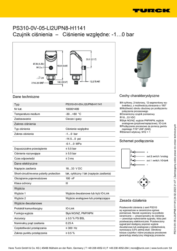 Turck Przełącznik 1 szt. PS310-1V-02-LI2UPN8-H1141 -1 bar do 1 bar