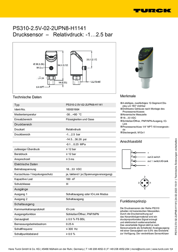 Turck Przełącznik 1 szt. PS310-2.5V-02-LI2UPN8-H1141 -1 bar do 2.5 bar