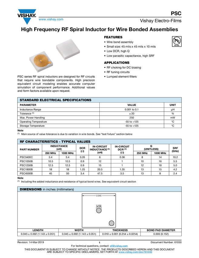 High Frequency RF Spiral Inductor for Wire Bonded Assemblies
