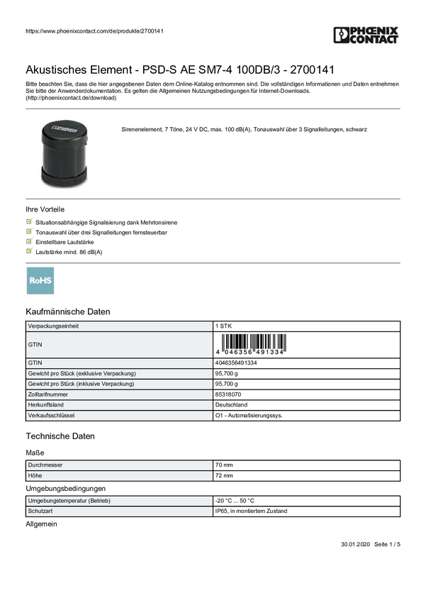 Syrena miniaturowa Phoenix Contact PSD-S AE SM7-4 100DB/3 2700141 1 szt.