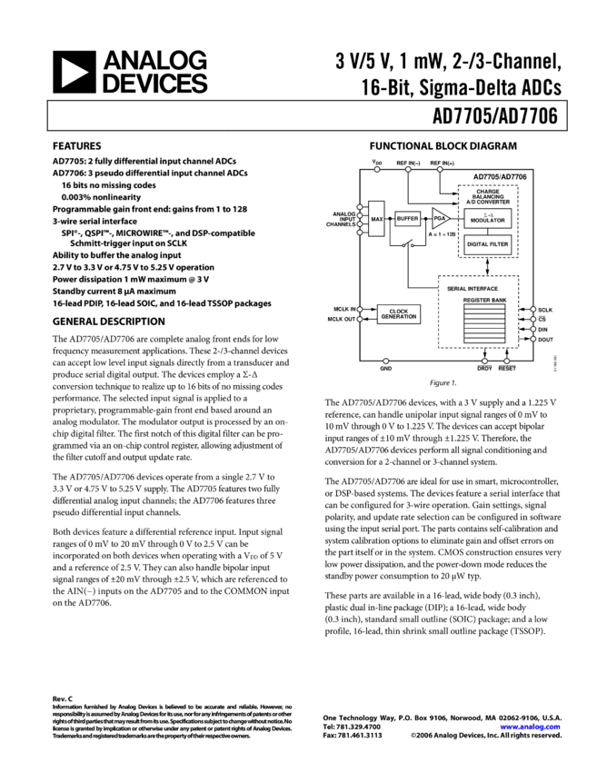 AD7706: 3V/5V, 1mW, 3-Channel Pseudo Differential, 16-Bit Sigma-Delta ADC
