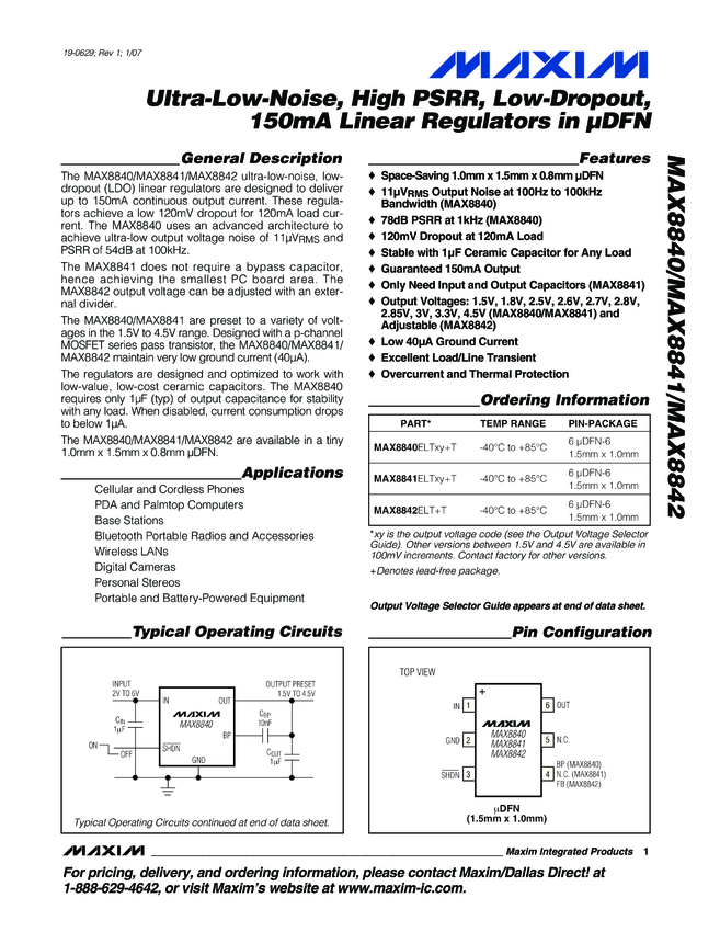 MAX8840, MAX8841, MAX8842 Ultra-Low-Noise, High PSRR, Low-Dropout, 150mA Linear Regulators in µDFN