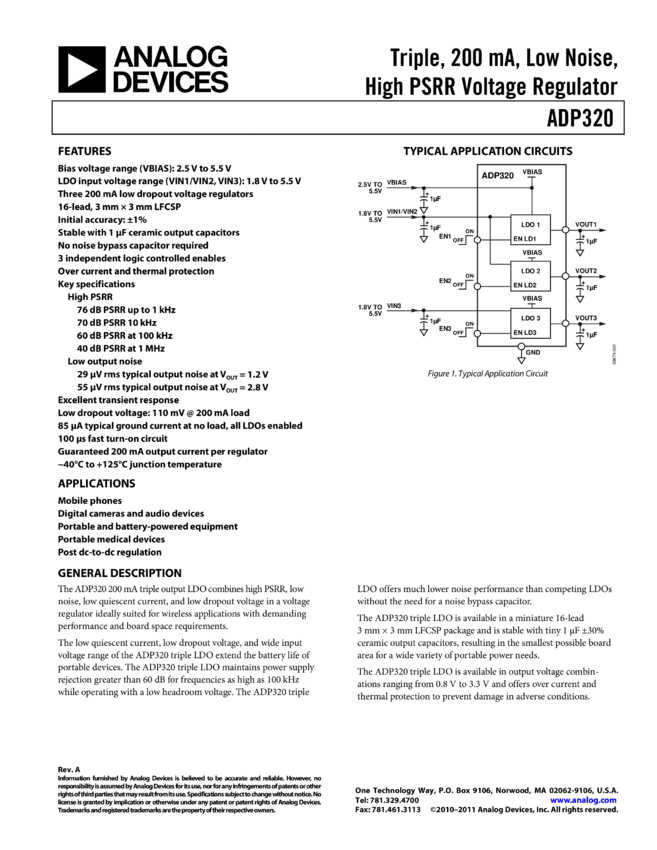 ADP320: Triple, 200 mA, Low Noise, High PSRR Voltage Regulator