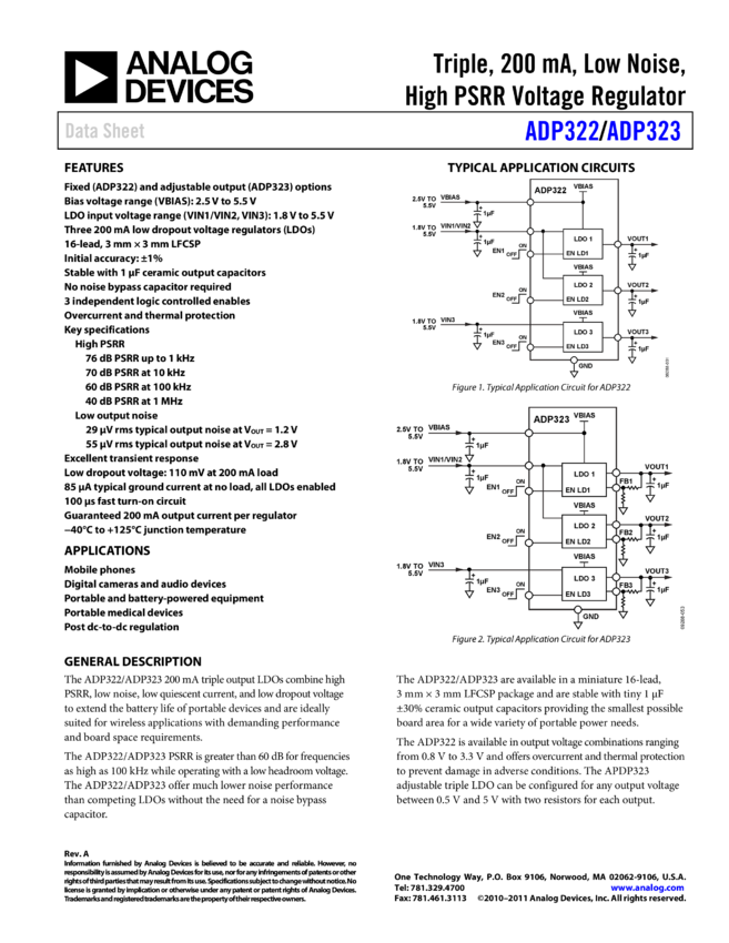 ADP323: Triple, 200 mA, Low Noise, High PSRR Voltage Regulator