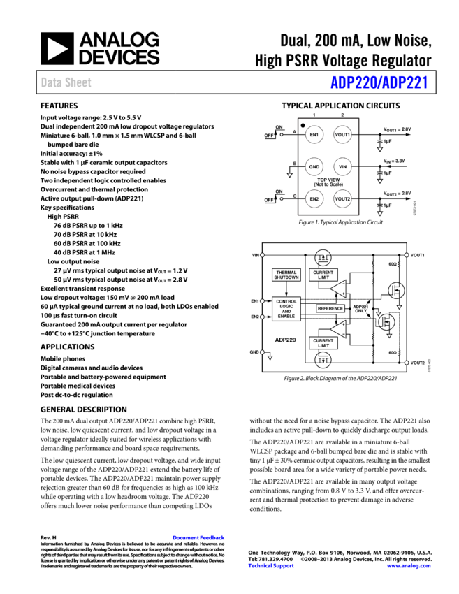 ADP221: Dual, 200 A, Low Noise, High PSRR Voltage Regulator