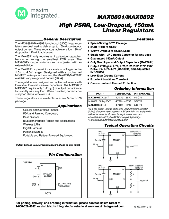 MAX8891, MAX8892 High PSRR, Low-Dropout, 150mA Linear Regulators