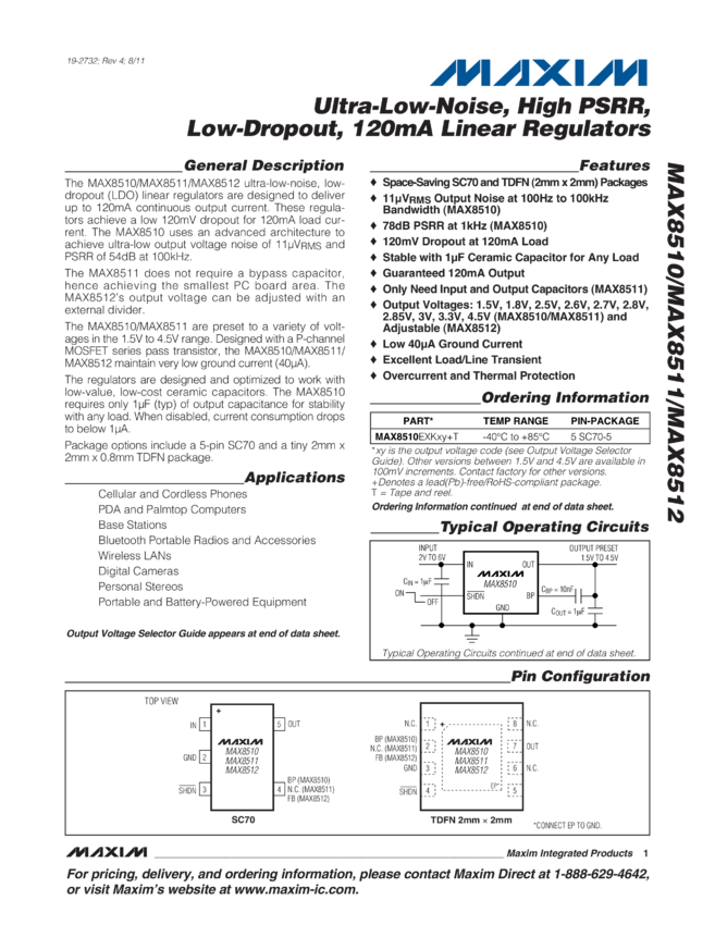 MAX8510, MAX8511, MAX8512 Ultra-Low-Noise, High PSRR, Low-Dropout, 120mA Linear Regulators