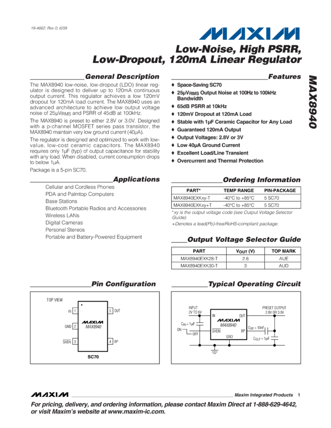 MAX8940 Low-Noise, High PSRR, Low-Dropout, 120mA Linear Regulator