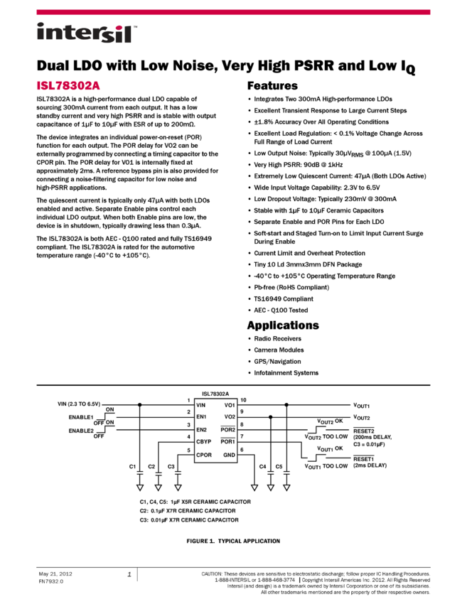 Dual LDO with Low Noise, Very High PSRR and Low I