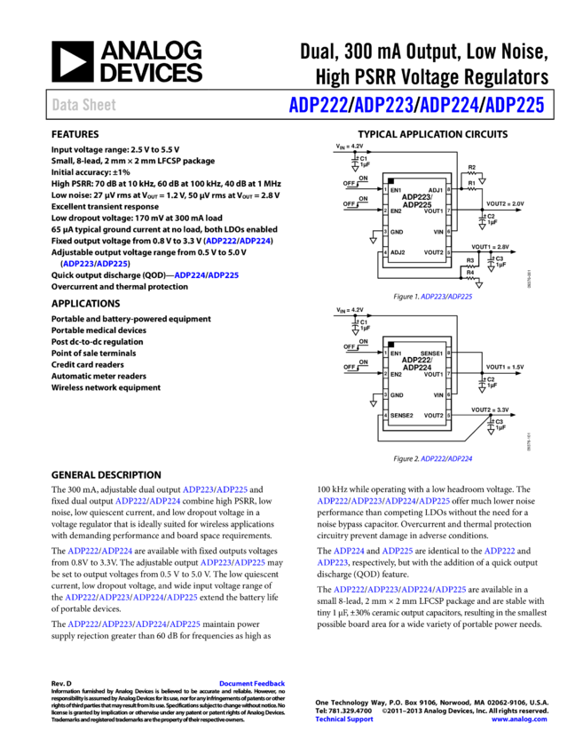 ADP225: Dual, 300 A Adjustable Output, QOD, Low Noise, High PSRR Voltage Regulator