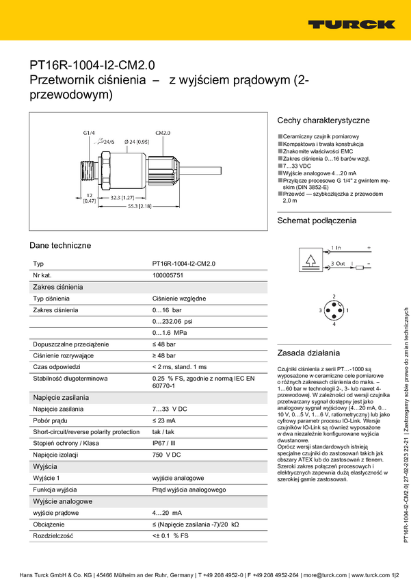 Turck Przetworniki ciśnienia 1 szt. PT16R-1004-I2-CM2.0