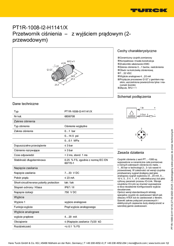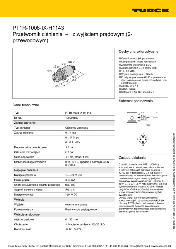 Turck Przetworniki ciśnienia 1 szt. PT1R-1008-IX-H1143