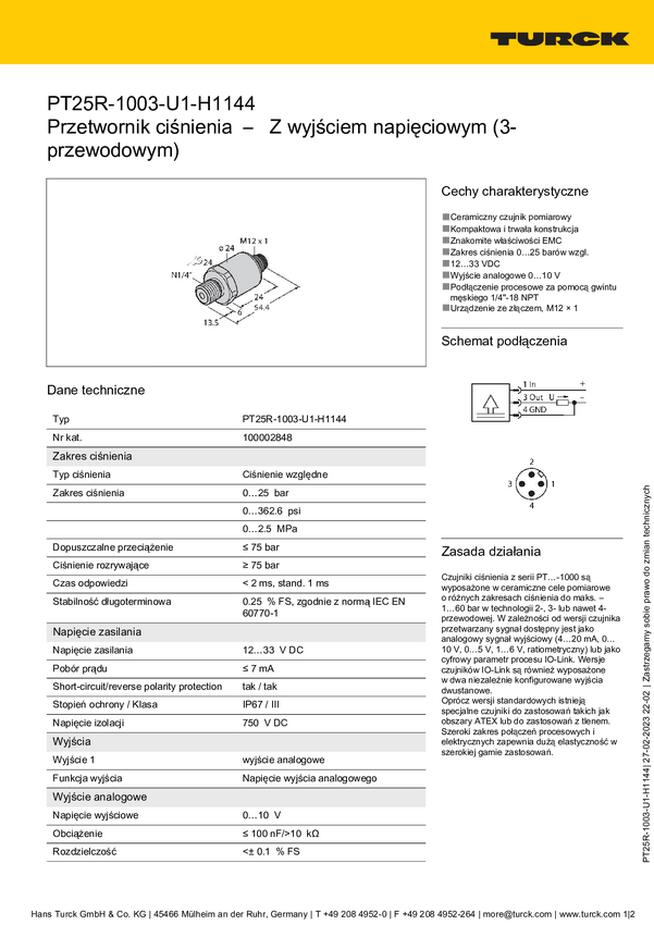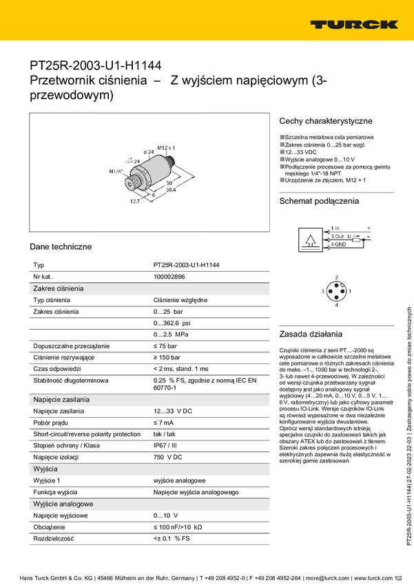 Turck Przetworniki ciśnienia 1 szt. PT25R-1003-U1-H1144