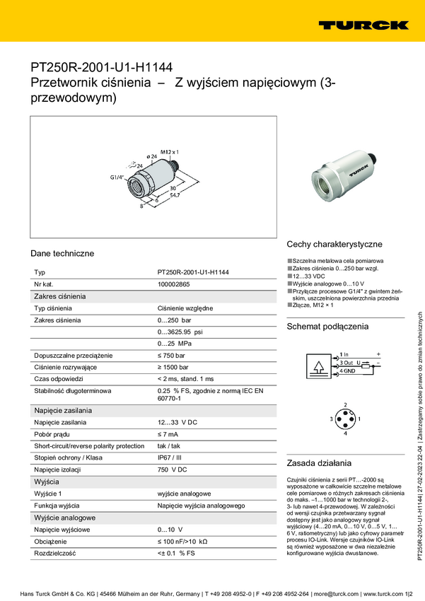 Turck Przetworniki ciśnienia 1 szt. PT250R-2004-U1-H1144