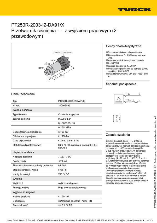 Turck Przetworniki ciśnienia 1 szt. PT250R-2003-I2-DA91/X