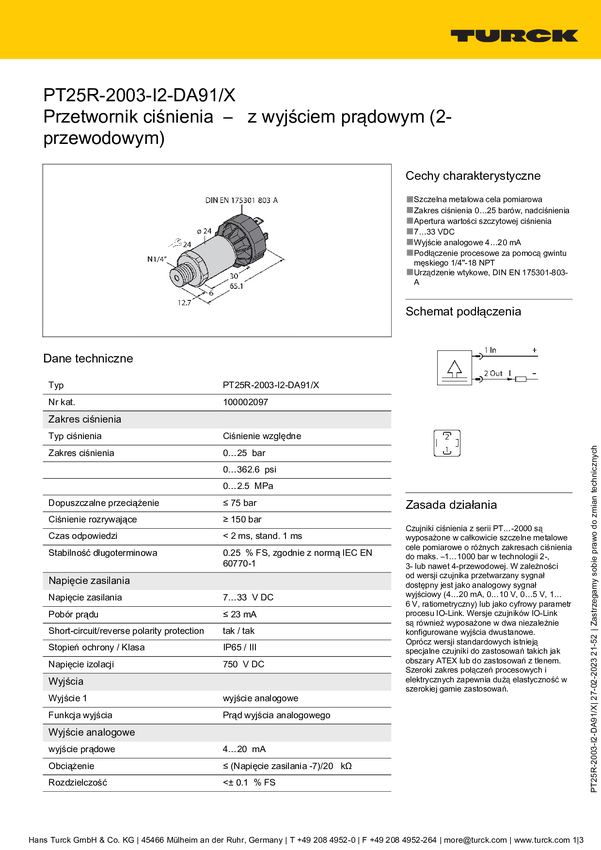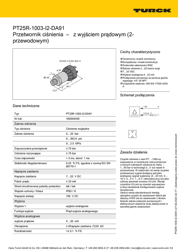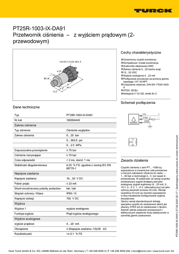 Turck Przetworniki ciśnienia 1 szt. PT25R-1003-I2-DA91