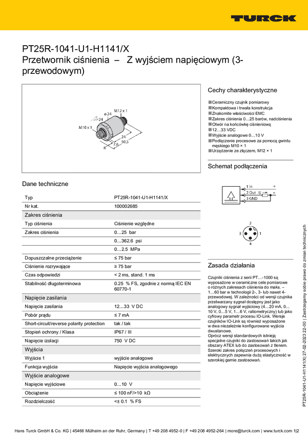 Turck Przetworniki ciśnienia 1 szt. PT25R-1041-U1-H1141/X