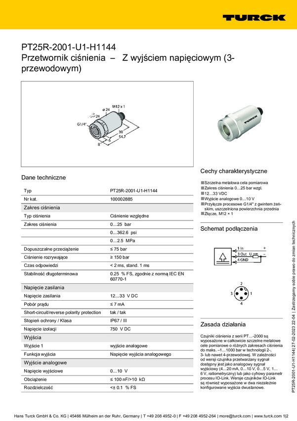 Turck Przetworniki ciśnienia 1 szt. PT25R-1001-U1-H1144