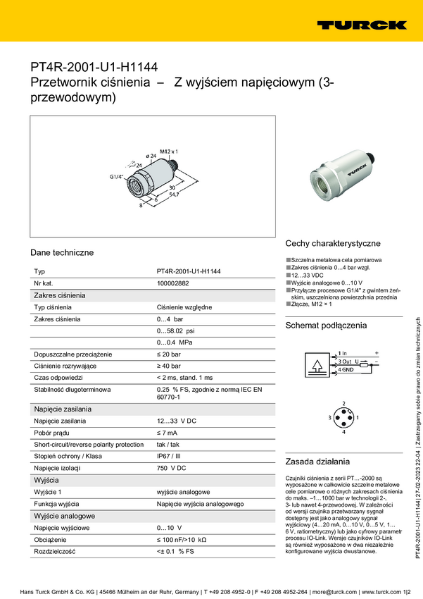 Turck Przetworniki ciśnienia 1 szt. PT4R-1004-U1-H1143