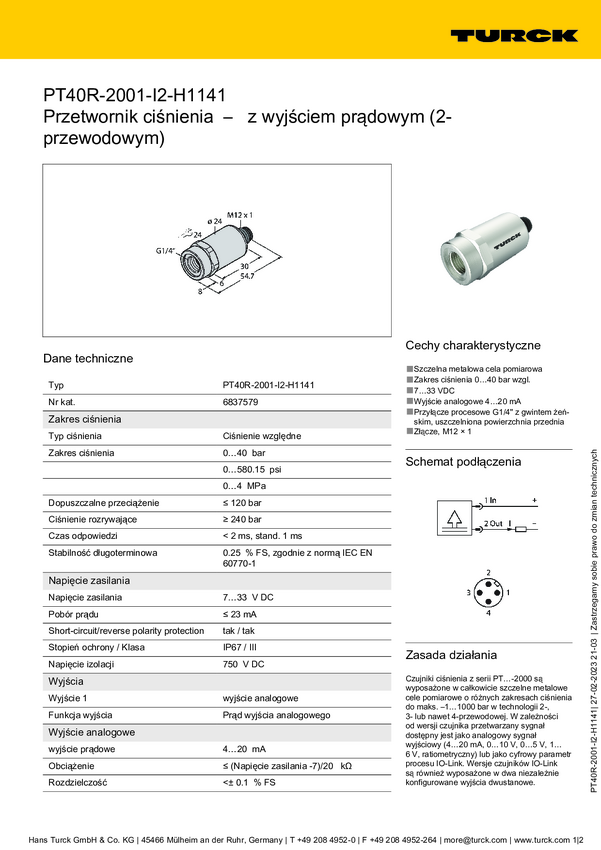Turck Przetworniki ciśnienia 1 szt. PT40R-2001-I2-H1141