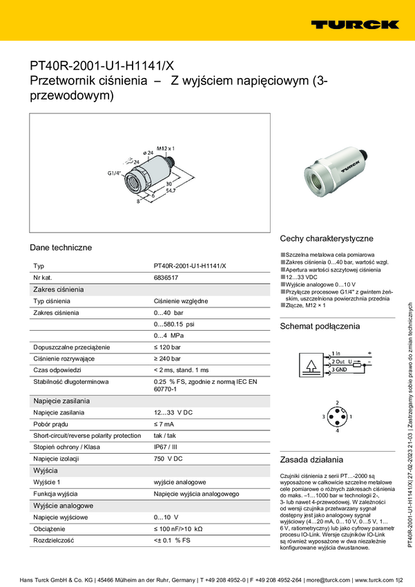 Turck Przetworniki ciśnienia 1 szt. PT40R-2001-U1-H1141/X