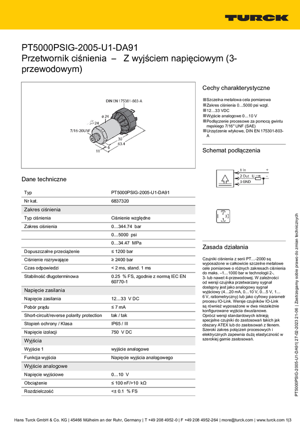 Turck Przetworniki ciśnienia 1 szt. PT5000PSIG-2021-U3-H1143