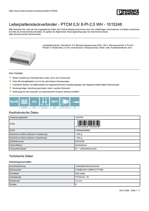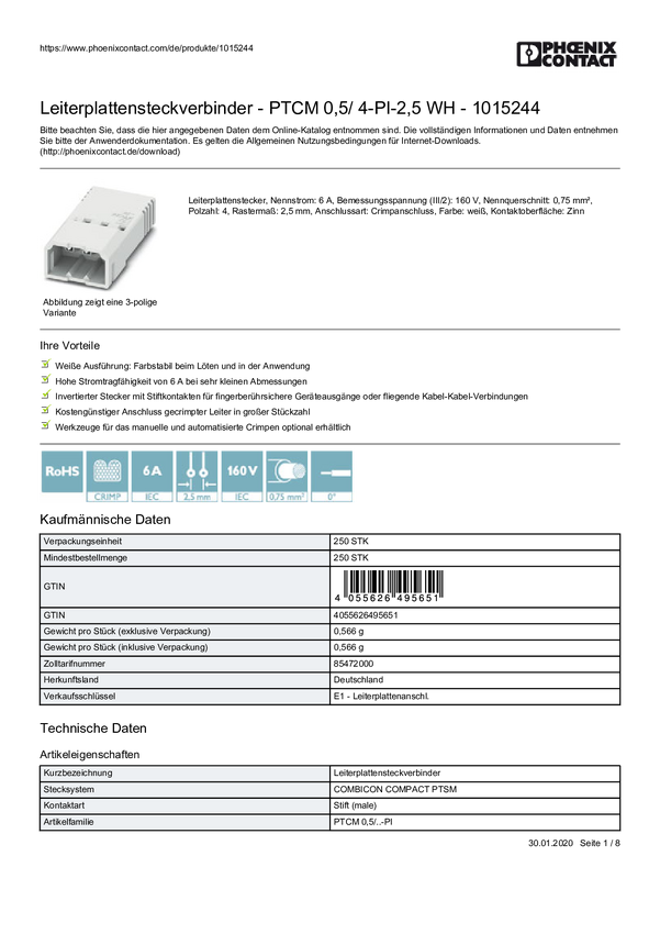 Phoenix Contact 1015245 Obudowa złącza pin męskiego na kabel PTCM 0,5/ 5-PI-2,5 WH, piny: 5, 6 A, 100 szt.