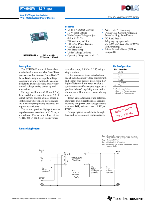 Module DC-DC 1-OUT 0.8V to 3.6V 6A 6-Pin DIP Module T/R
