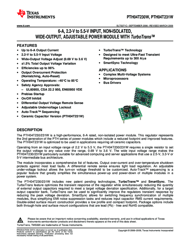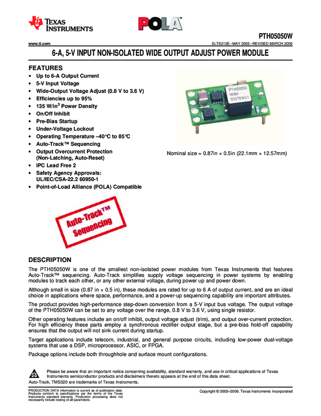 Module DC-DC 1-OUT 0.8V to 3.6V 6A 21.6W 6-Pin SMD T/R