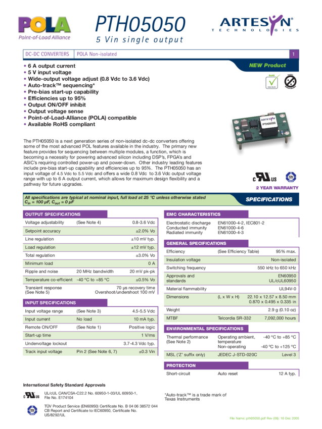 Module DC-DC 1-OUT 0.9V to 3.6V 6A 5-Pin DIP Module T/R