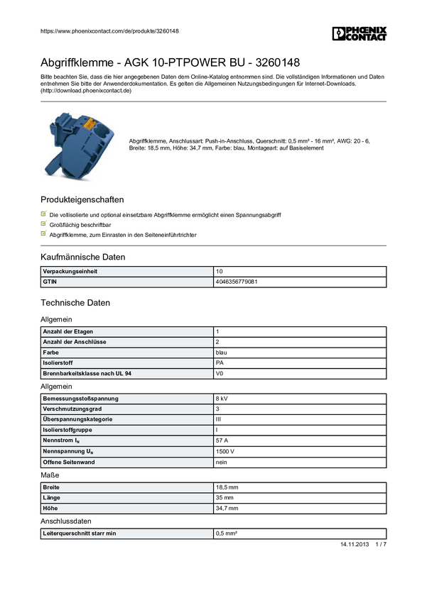 Złącze odgałęzień Phoenix Contact AGK 10-PTPOWER BU, 3260148.