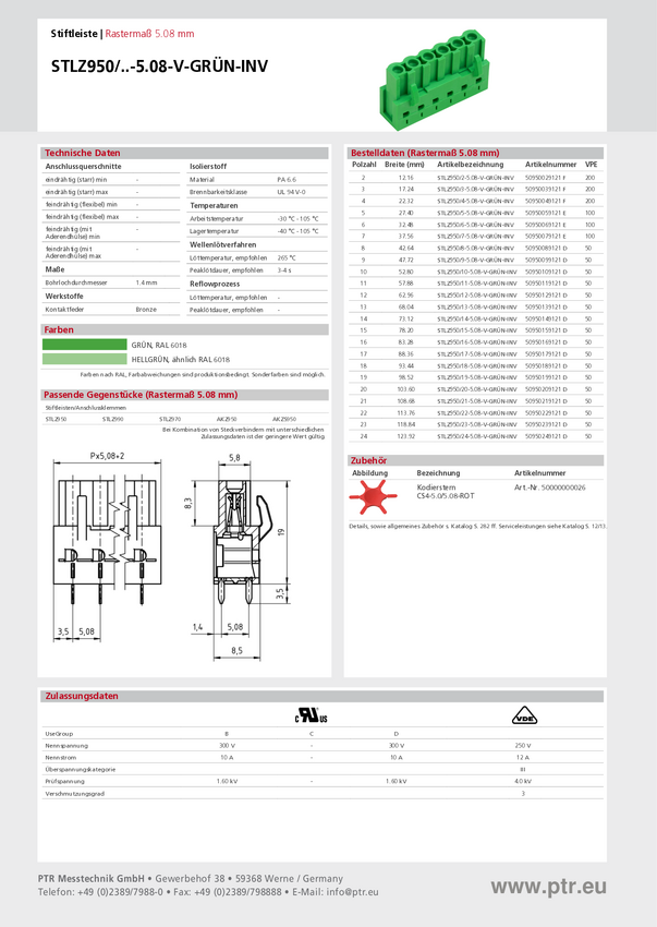 Obudowa złącza pin męskiego na PCB PTR Hartmann 50950039121F, Ilość pinów 3, Wymiary siatki: 5.08 mm, 1 szt.