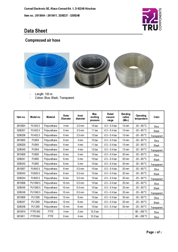 Wąż do sprężonego powietrza TRU COMPONENTS PU12X8 TC-10462436, 10 bar, 12 mm x 100 m