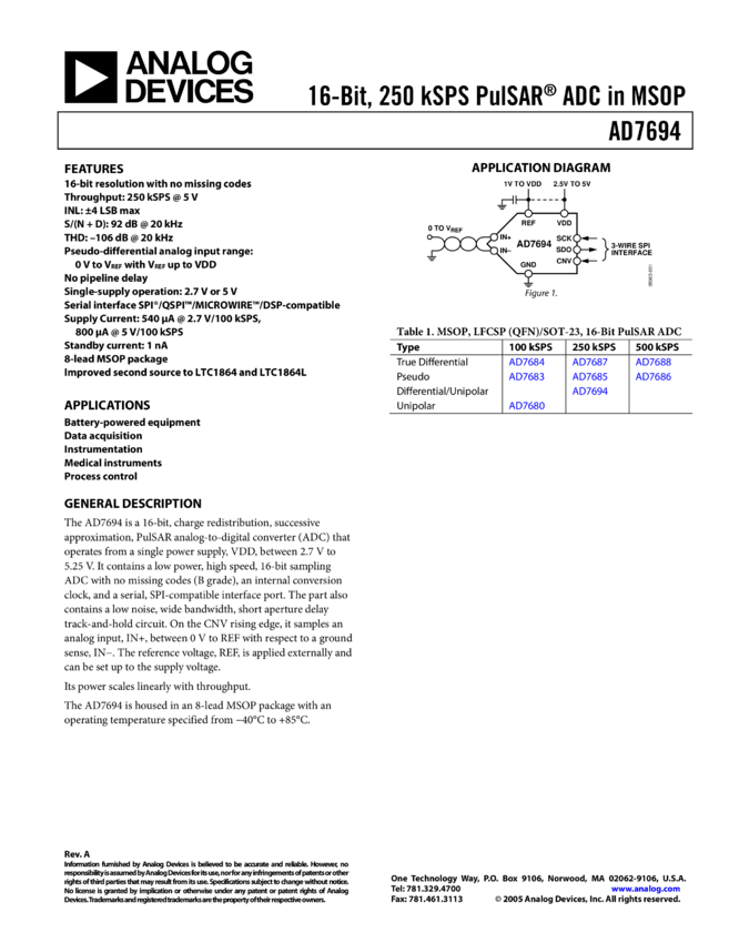 AD7694: 250 kSPS 16-BIT PulSAR® A/D Converter in SOIC