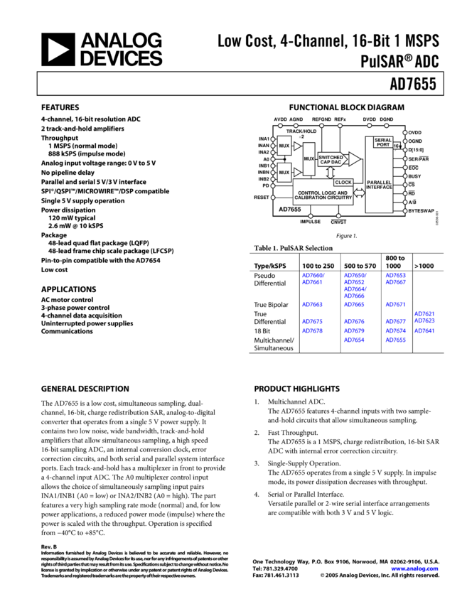 AD7655: Low Cost, 4-Channel, 1 MSPS 16-Bit PulSAR® A/D Converter