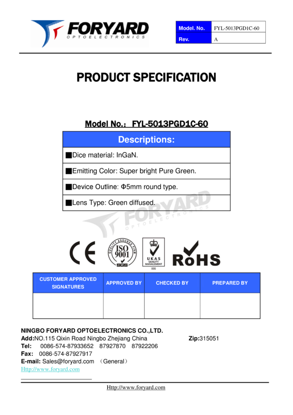 #Dioda LEDU-5GD60-F, 5mm, zielona (Pure Green) 522 nm, ultrajasna 2300 mCd, dyfuzyjna, 60 stopni, Foryard /1000szt.