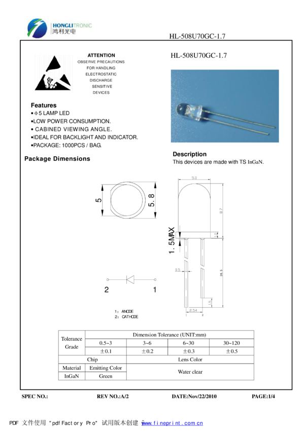Dioda LED, 5mm, (Pure Green), 520 nm, superjasna 3700 mCd, water clear, 55 stopni, STRAW HAT, Honglitronic
