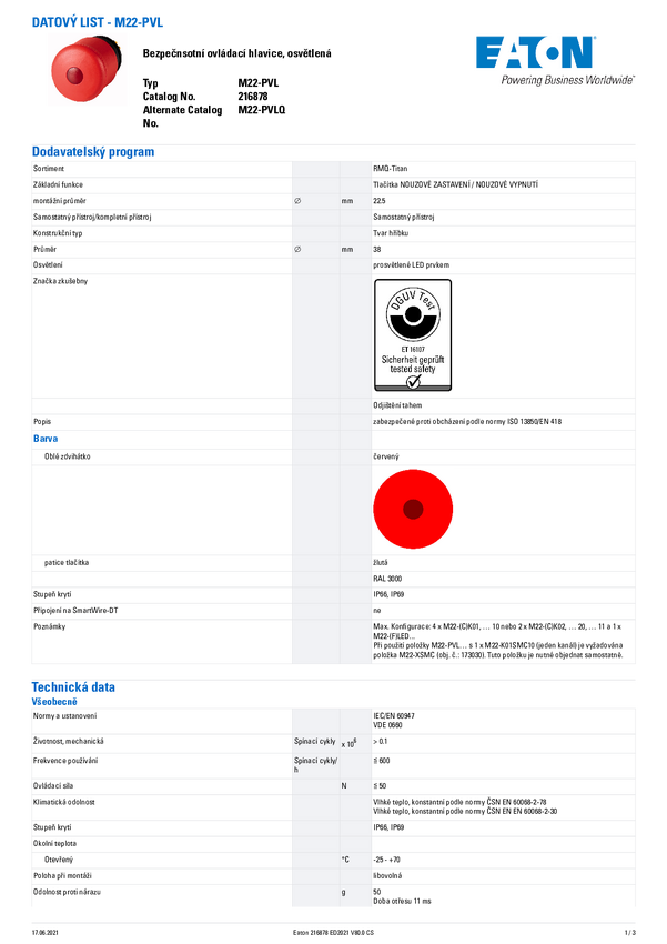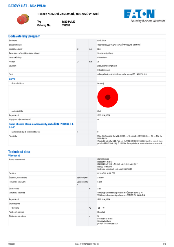 Eaton 197537 Wyłącznik awaryjny M22-PVL30, 1 szt.