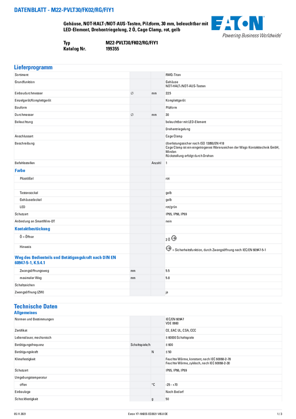 Eaton 199355 Wyłącznik awaryjny M22-PVLT30/FK02/RG/FIY1, 2 NC, 1 szt.