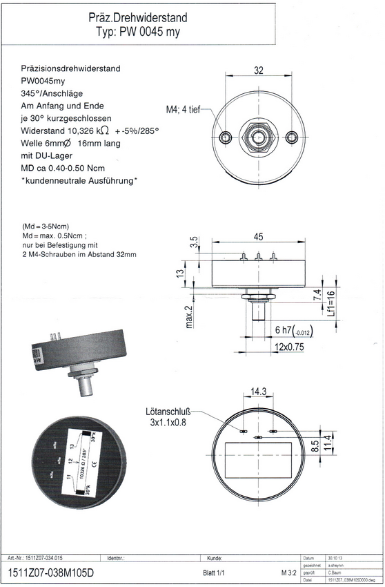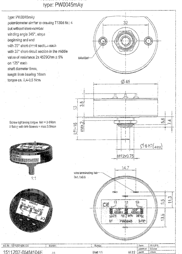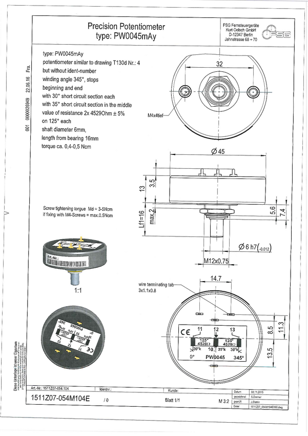 Potencjometr przewodzący plastik; ośka 6mm,dł.16mm; 2xM4; Kąt mech.345 st; el.:30st short, 125 st 4529, 35st short,125 st 4529; 30 st short; 1511z07-054-004; 1511z07-054-104; Nasze oznaczenie PW0045-CT-10K-T130G-N T130/4 Tolerancja rezystancji +-5%; liniowość LIN+-0,5%; moc wersji stand ard 1,5W Uwaga: w róńym czsie producenci pod oznaczeniem T130..N4 mieli potencjometr o kącie pracy 345 stopni ale z różną charaktery styką - stosowaną najczęściej wymiennie. Inne oznaczenia T130C Nr.4