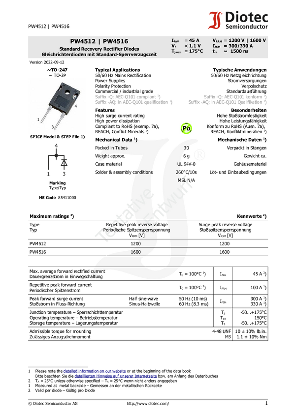 Dioda prostownicza Diotec PW4512 N/A N/A