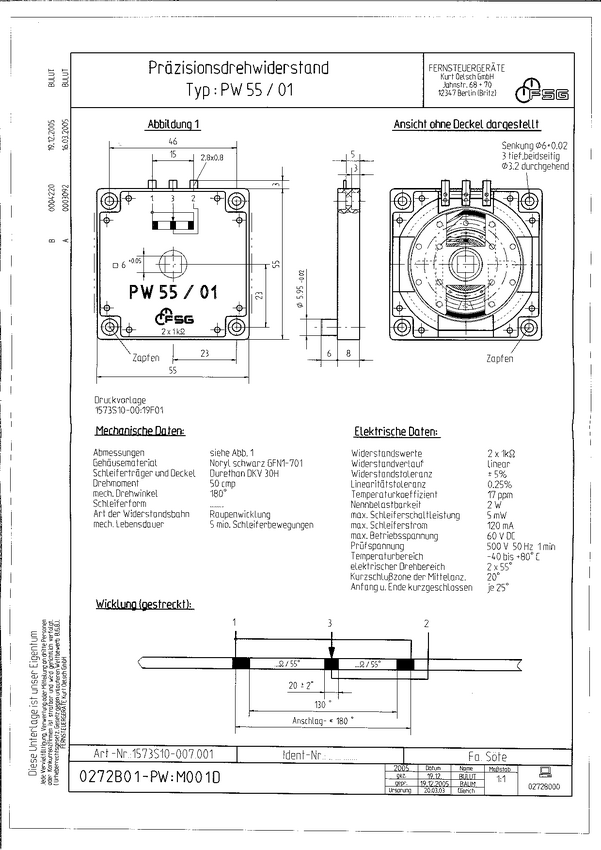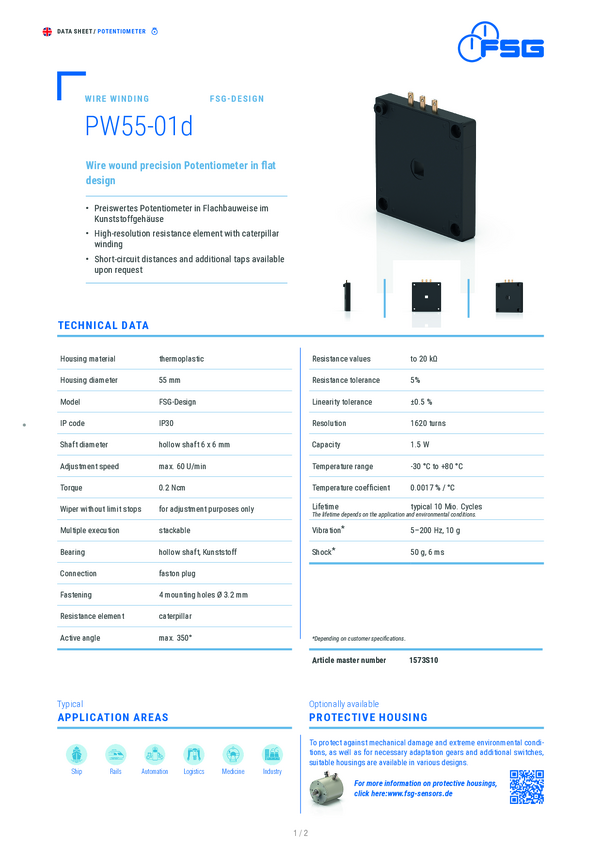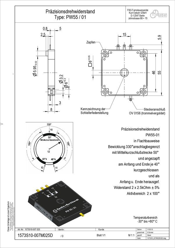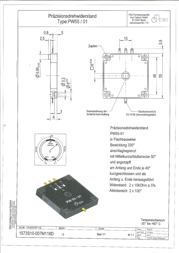 Potencjometr specjany na bazie korpusu PW55 podobny do PD550 55x55x8mm; rozstaw śrub 46x46 mm; Rotation angle 330 deg stops; active angle 80 deg Resistance 8 kohm +-5%; start and end each 135 deg; IP50 Housin Lifetime 10 mill cycles; machanical angle 330 deg; electrical a e 350 deg; Resistance tolerance +-5%; Linearity +-1%; max slide urrent 120mA; torque 0,2Ncm; temperature range -30 - + 80 deg c Uwaga: zdjęcie podobnego