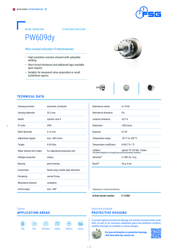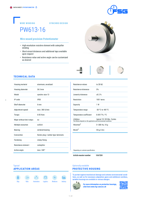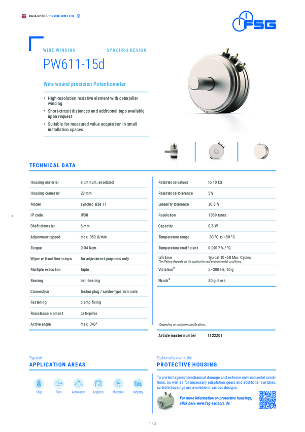 Precision Angular Position Potentiometer PW620 1571Z80-269.001 1571Z80-269.001 Precision Angular Position Transmitter PW620/90-42MIId in servo casing size 20 with 2 isolated windings on isolated winding bodies winding each 360° wiper rotate without limit stops each with 4 at 90° shifted tappings each with 2 at 90° shifted wipers resistance each approx. 5217 ? shunt resistor each approx. 1304 ? sense of rotation right with flat solder connection short design shaft 6 mm Ý 14 mm long ship's design, that means